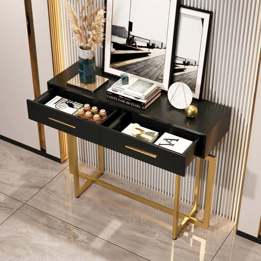 1000mm Modern Narrow Black Console Table with Storage Drawers and Metal Legs in Gold
