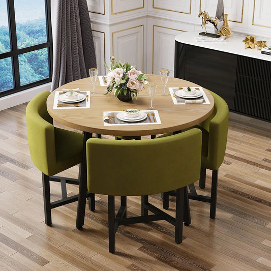 1000mm Round Wooden Nesting Dining Table Set for 4 Green Upholstered Chairs