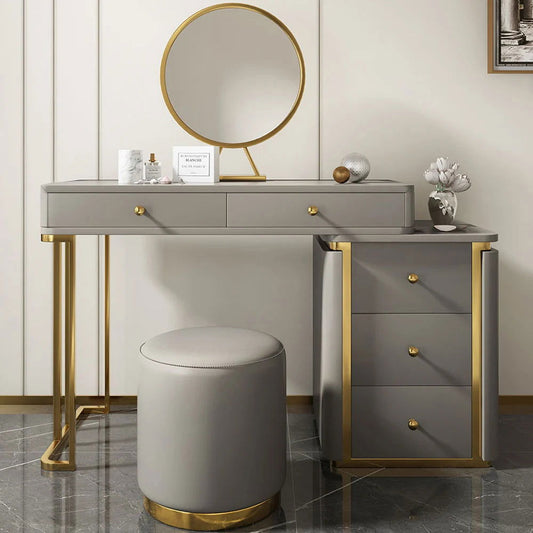 Nordic Makeup Vanity Extendable with 5-Drawer Dressing Table with Stone Top in Champagne