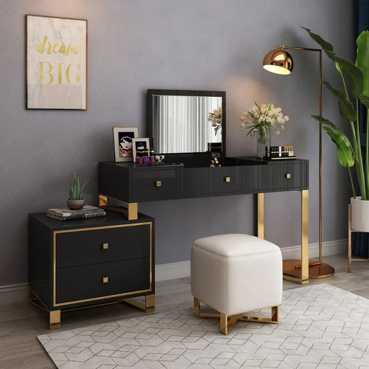 Modern Black Makeup Vanity Set Dressing Table with Lighted Mirror Cabinet & Stool